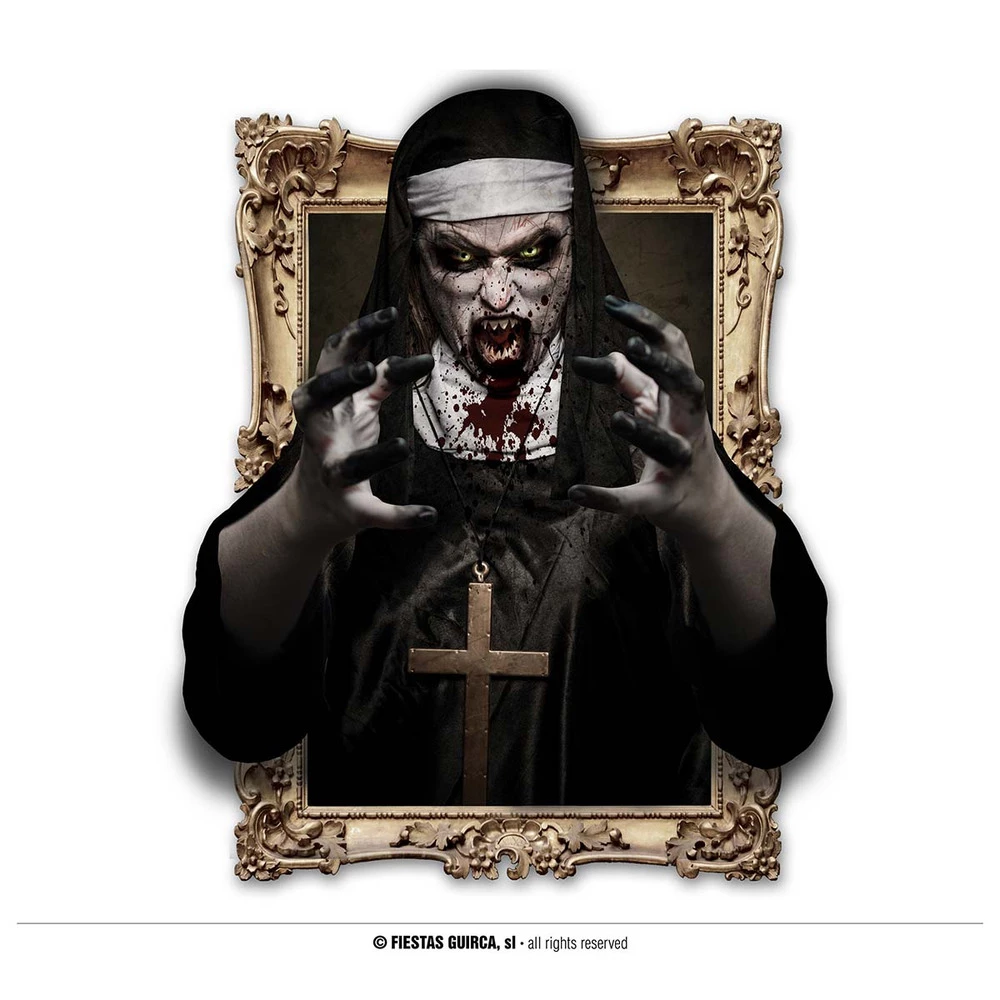 This adhesive wall decoration is perfect for your home during Halloween, the scary nun breaking free from the portrait will leave your guests on edge.Â