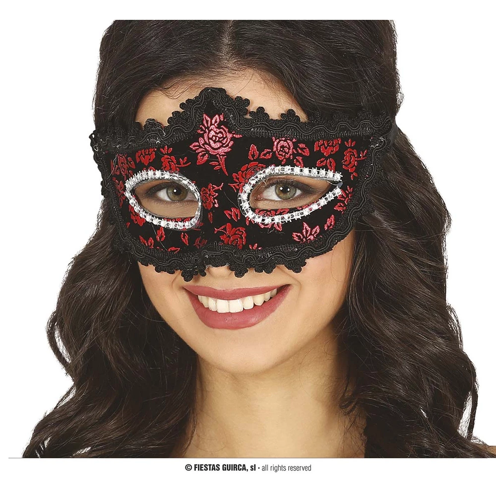 Try something different with this Red and Black Antifaz eye mask! Complete with Ornate lace edges and White Outlines around the eyes this stunning accessory will prove useful! the Mask can also fit multiple sizes thanks to the elastic Band which helps the mask fit comfortably.Â