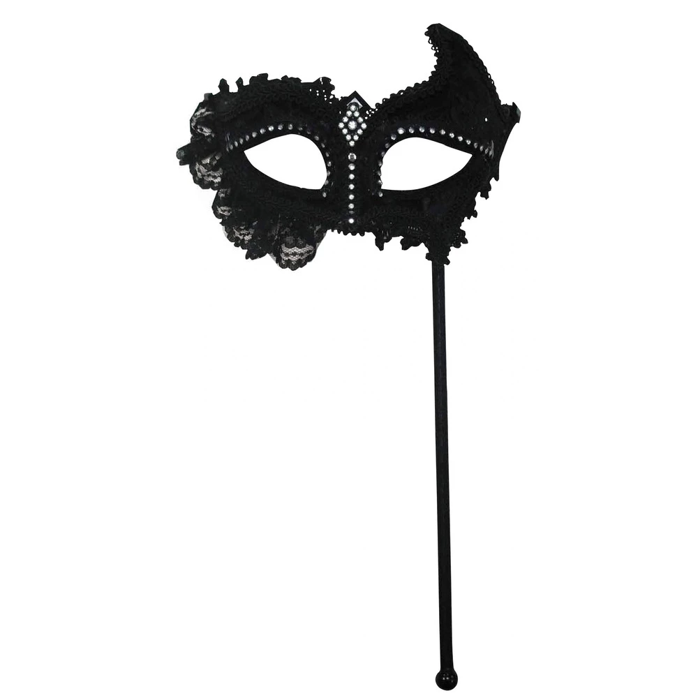 This black masqeurade face mask is perfect for adding an elegant touch to your outfit, the face mask is attached to a stick. The beautiful lace and diamond details makes the mask stand out.