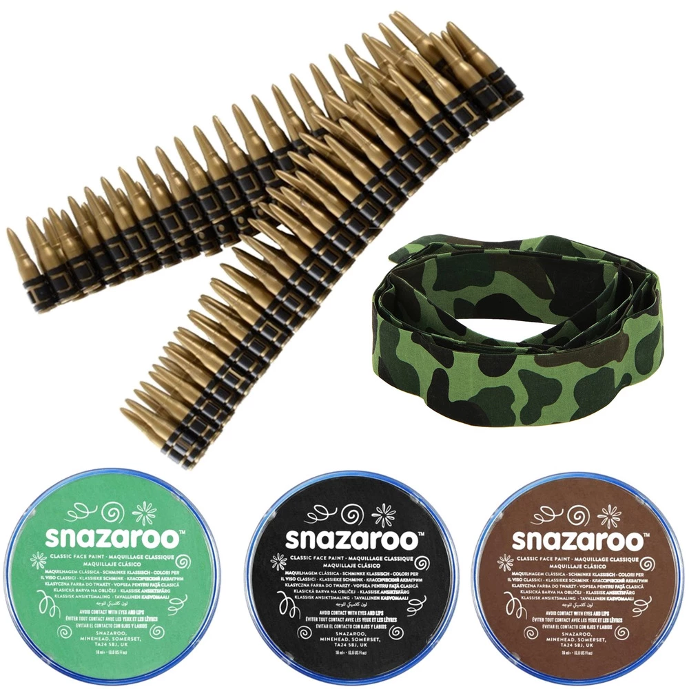 Become the Lone Soldier himself with this Bullet Belt, Headband & Face Paint Bundle set! Simply add some military style clothes underneath these accessories and paint on your Favourite camouflage with the face paint for a convincing Military look!Â