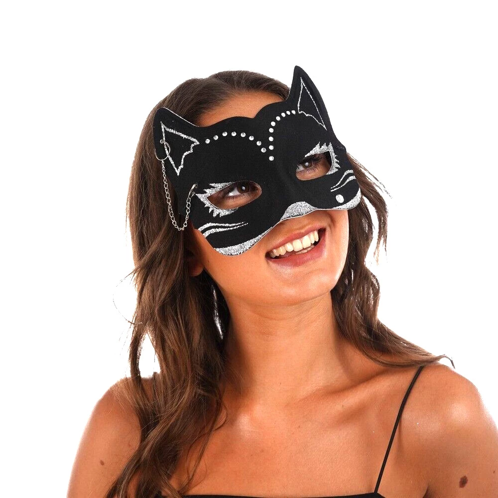 Looking for a cat mask with a twist, well we have just that! This beautiful silver and black cat mask comes with plenty of detail to add a special touch. The glitter details are paired with silver sequins and a silver chain which really completes the mask. Pair the mask with a black tutu and black long gloves to complete the look, perfect for your Halloween party.