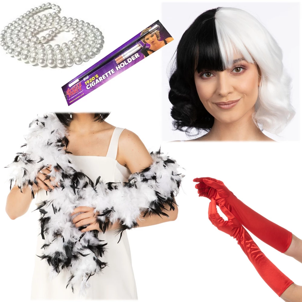 Become the world’s best known Fashion Villain with this Devilla Accessories Bundle set! Simply add a black or white dress with these accessories for a cheap and reusable costume with many uses including 1920s!Â
