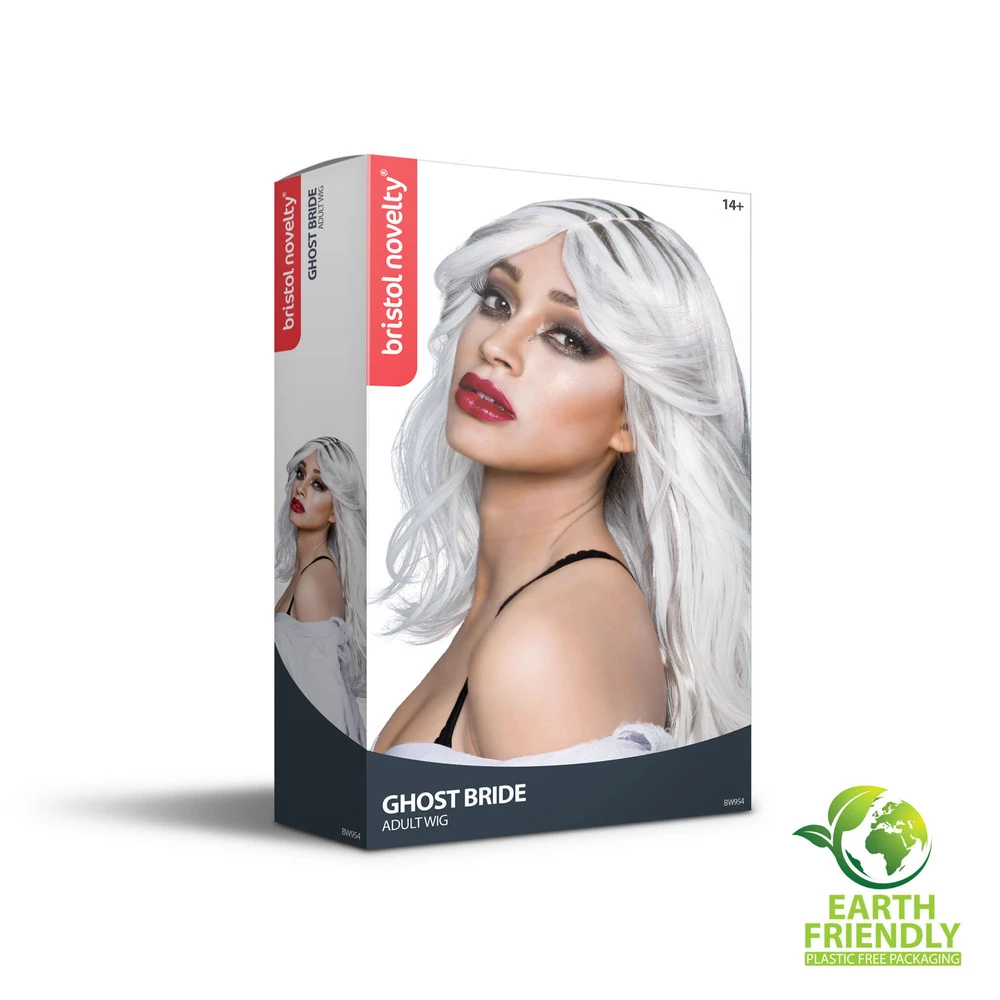 This Ghost Bride wig can drastically change your look and get you prepared for Halloween. The white wavy long wig includes black high lights to complete the look.