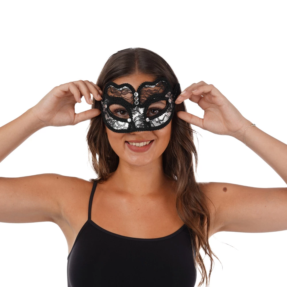 Looking to add a twist to your masquerade costume, this beautifully detailed eye mask will sure make you stand out from the crowd. The lace style front is complemented with a see through lace top, followed with three silver diamonds.