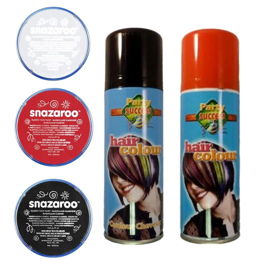 This bundle is perfect for you to complete the look for your fancy dress costume! This range of classic colours can be used for an array of outfits you might have. The face paint and hairspray is easily washable too!Â