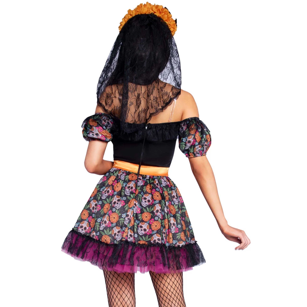 Look dead sexy with this Marigold Catrina fancy dress costume, the deluxe look and quality of this costume will have you rise from the dead. The pretty detail on the dress really makes it stand out, small sugar skull prints with a purple and black bottom frill.