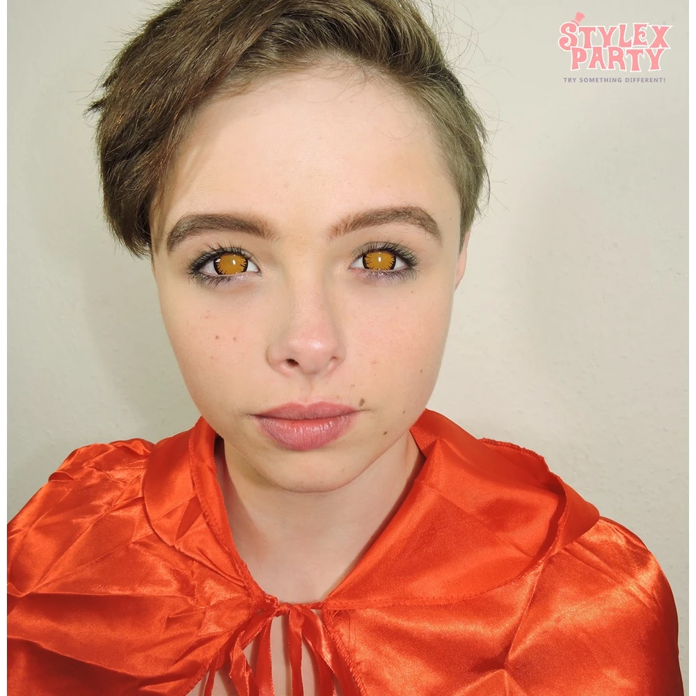 The crazy coloured contact lenses are orange with a dark outline, completely covering your natural eye colour giving you the professional horror star look.Â