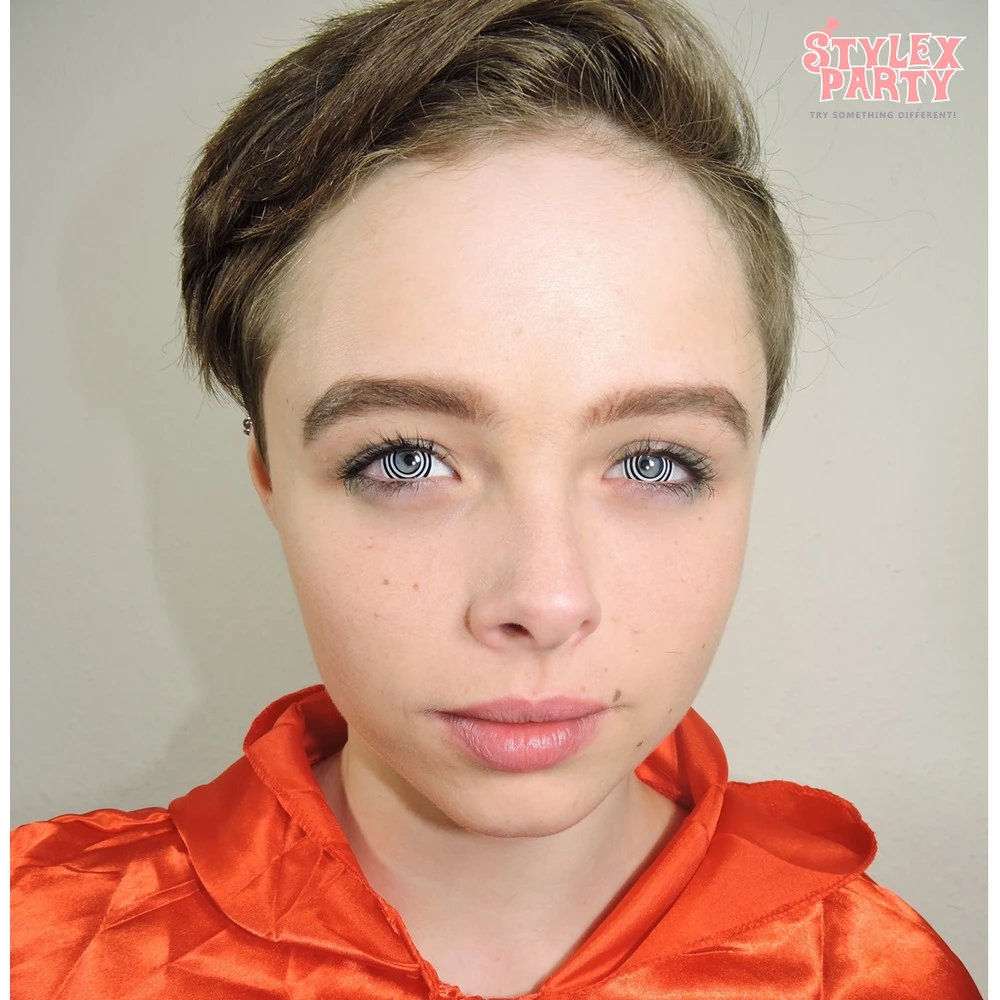 The crazy coloured contact lenses are white with black swirls, completely covering your natural eye colour giving you the professional horror star look.Â
