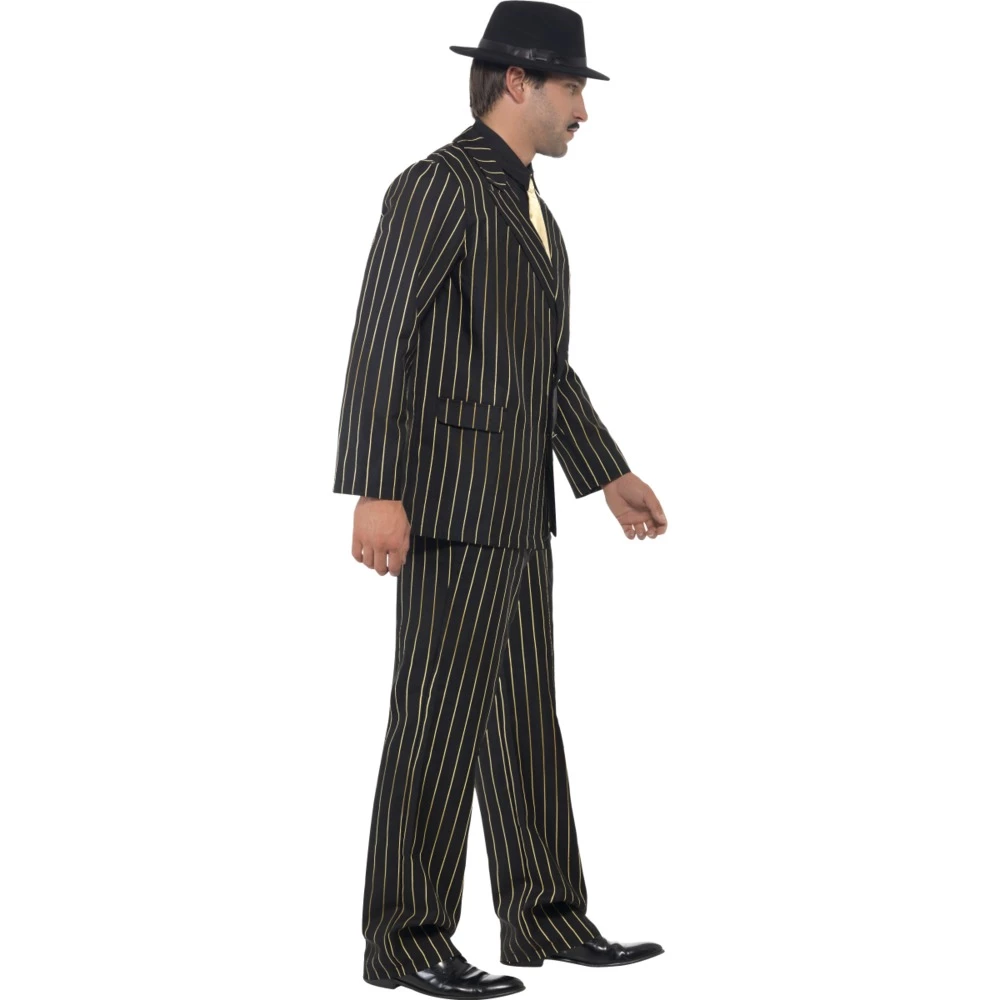 Rule the mob dressed in the Gold Pinstripe Gangster Costume. This male 20s inspired fancy dress outfit includes a jacket, trousers, shirt front and tie. For added style add our Gangster Hat.