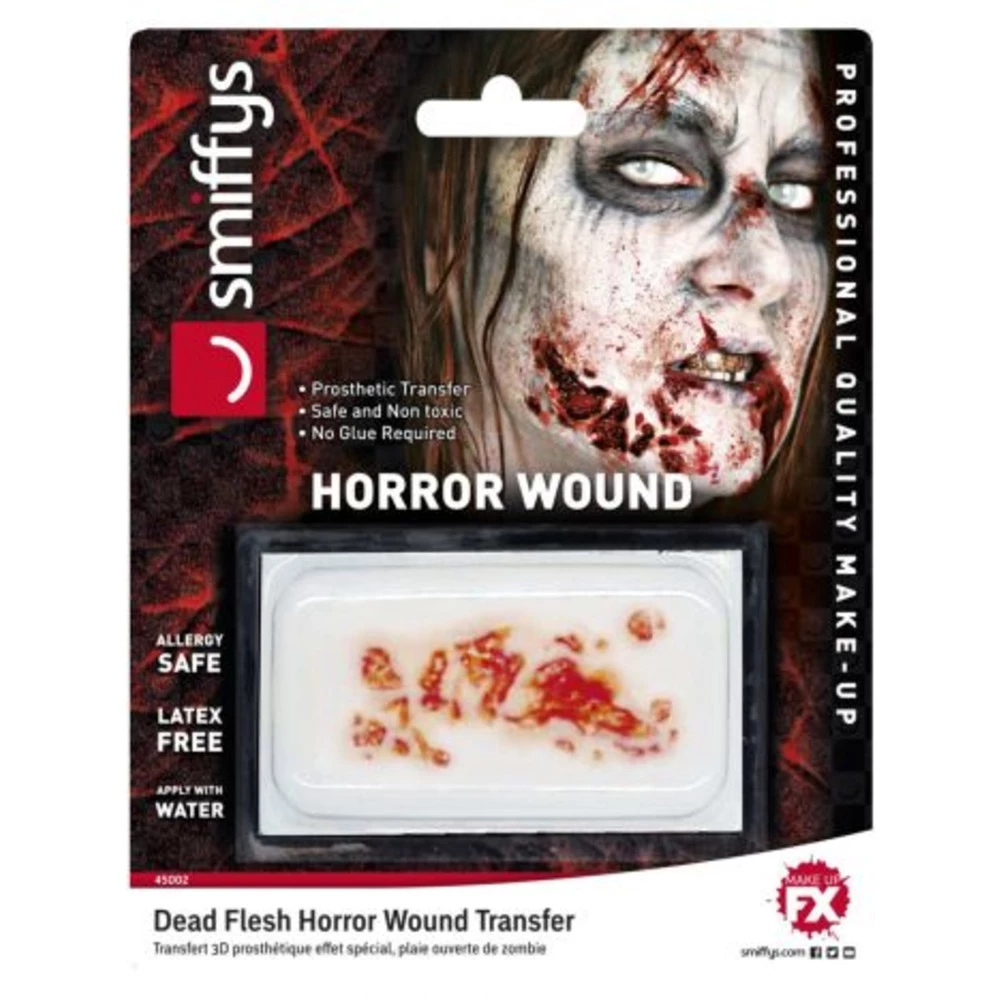 Add a Smiffys Horror Wound FX Transfer to complete your zombie look this Halloween! The Dead Flesh is a water based transfer which is allergy and latex free, plus it’s easy to apply and remove, and is sure to take your scary party look to the next level.