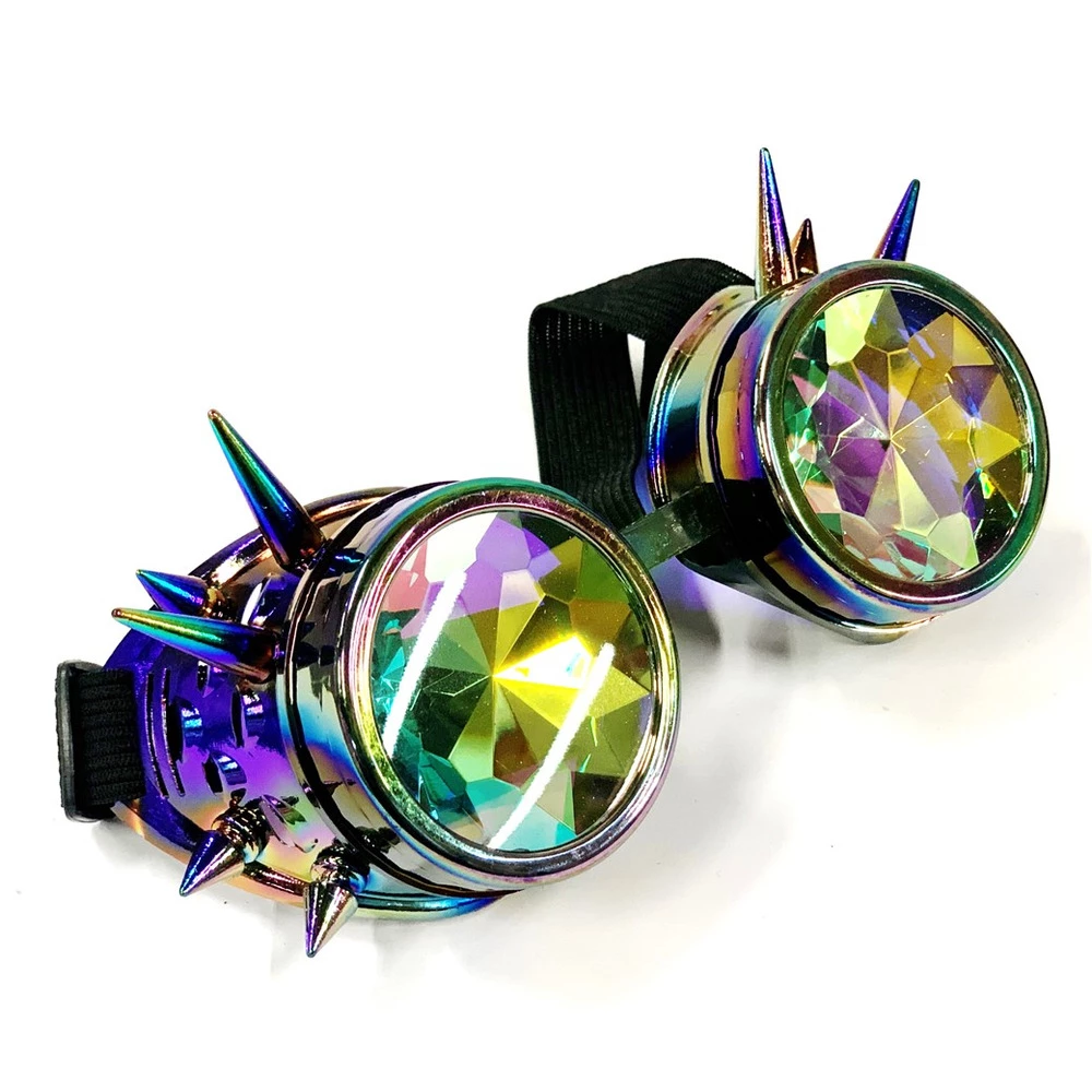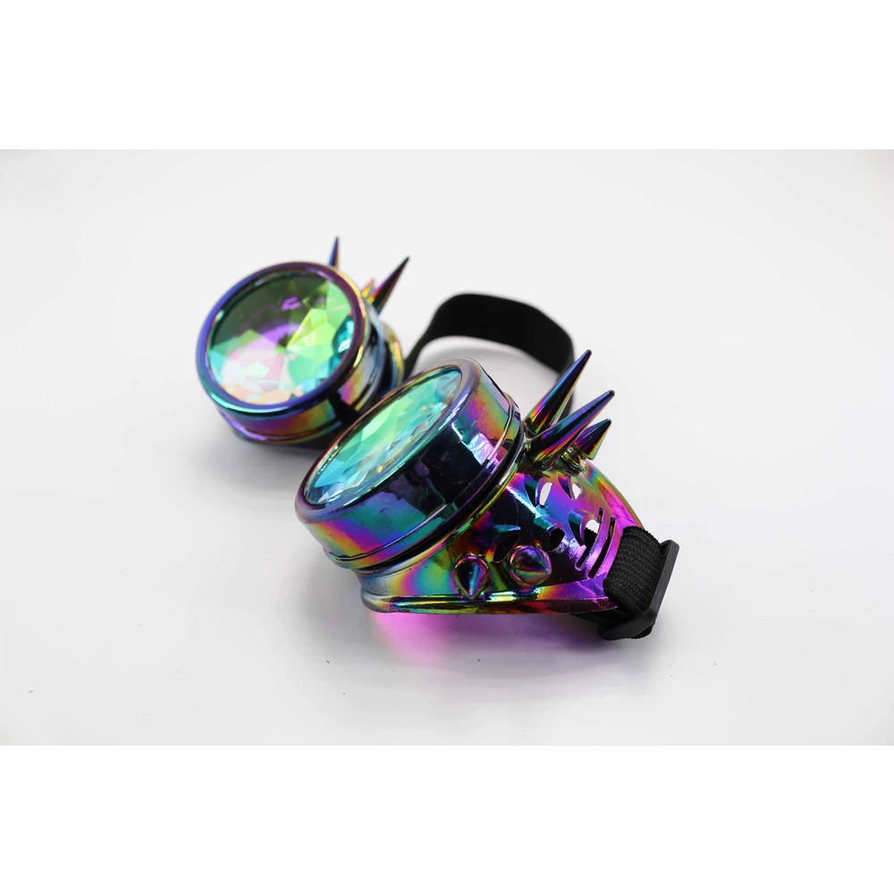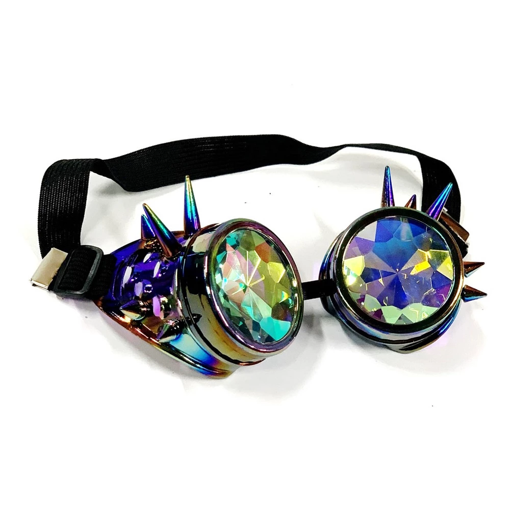 These beautiful goggles will make the perfect addition to any steampunk costume, automatically creating that vintage look. The rainbow design with the holographic goggles make the them really exciting. They can also be used at raves and concerts creating a Physedelic look. The goggles have a spike feature making the goggles look even more 3d than they already are.